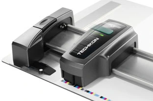 Die Systemlösung besteht aus zwei Komponenten: Mit dem motorisch angetriebenen Messgerät wird der gesamte Druckkontrollstreifen auf einem Druckbogen automatisch in Sekundenschnelle spektralphotometrisch abgetastet. Die dazugehörige PC-Software TECHKON ExPresso empfängt zeitgleich die Messwerte drahtlos per Funkmodul und sorgt für die übersichtliche Bildschirmanzeige aller relevanten Informationen, mit denen der Drucker die Druckmaschine steuert. Eine besondere Stärke von SpectroDrive liegt darin, dass es für beliebige Druckformate verwendet werden kann.